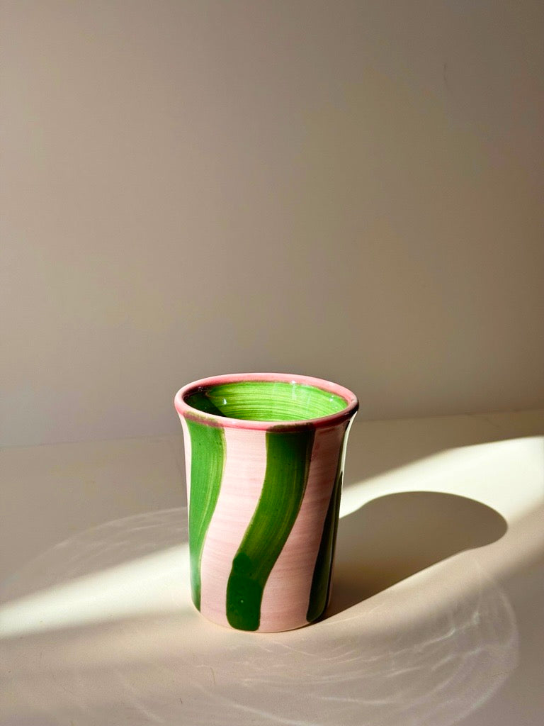 Ceramic Breakfast Cup - Green & Pink Stripes (250ml)