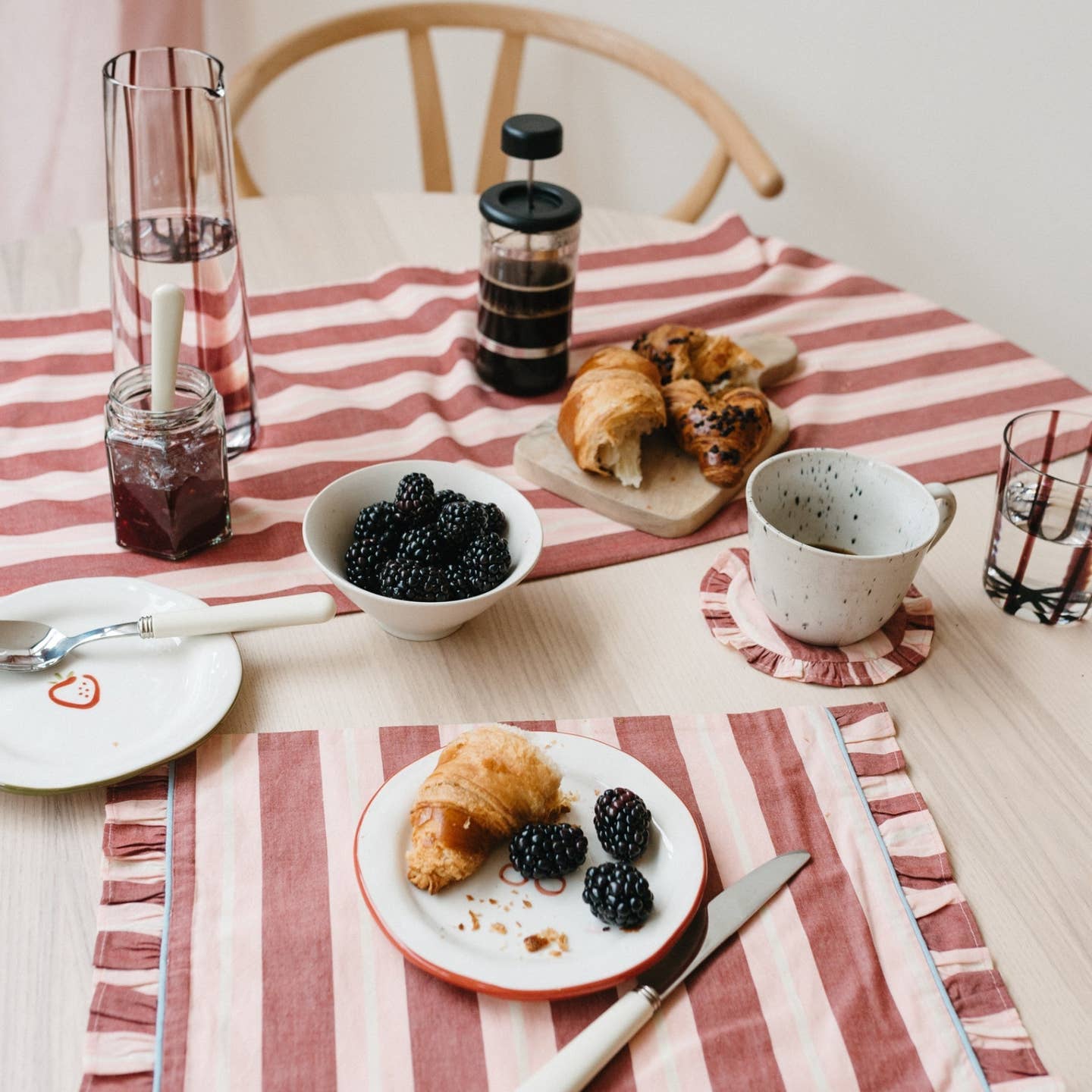 This cotton table runner features an eye-catching pink and red stripe pattern, a delightful frilled edge and contrast piping.