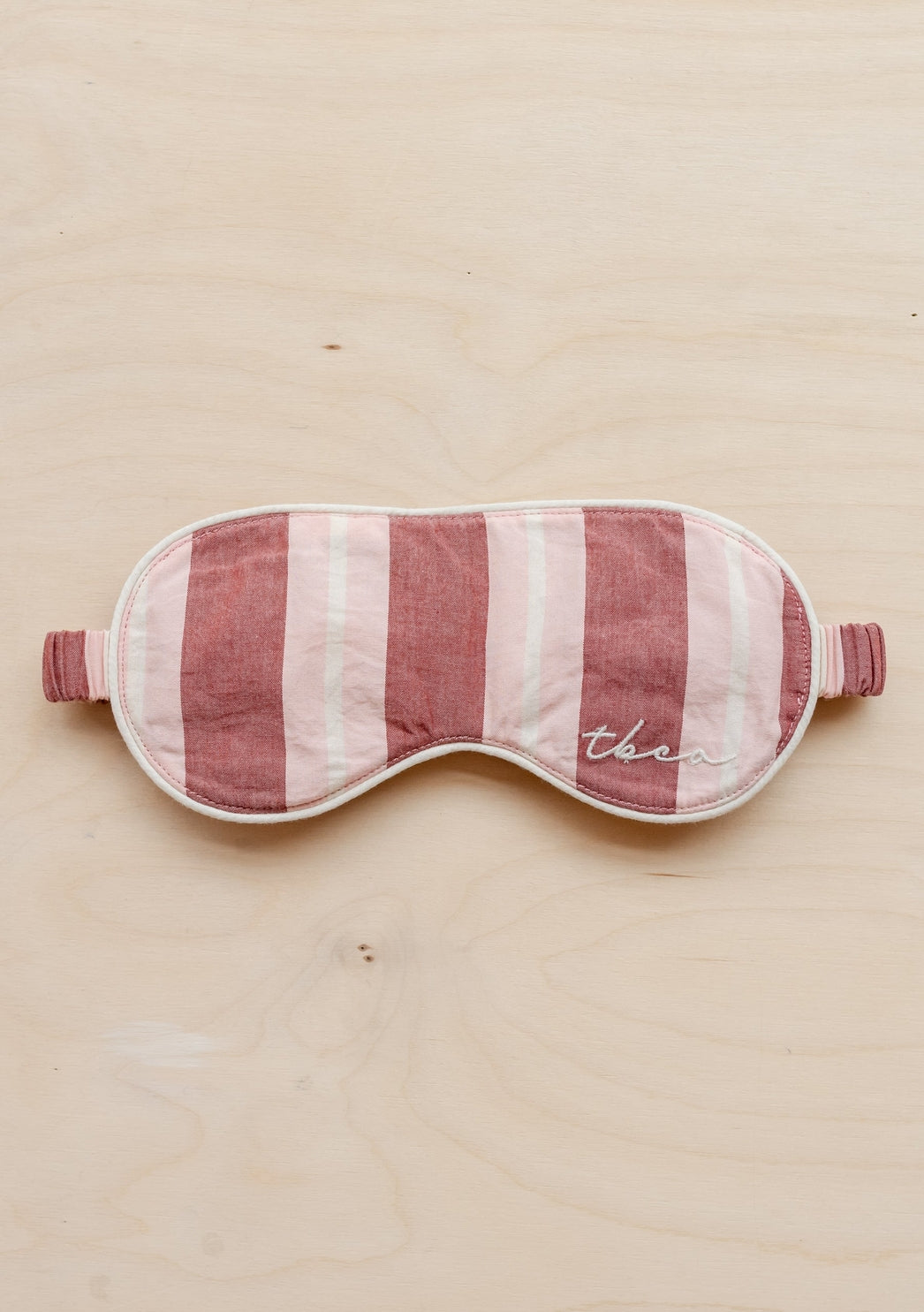Elevate your sleep routine with a padded eye mask in red and rose, featuring a stripe pattern and contrast piping.