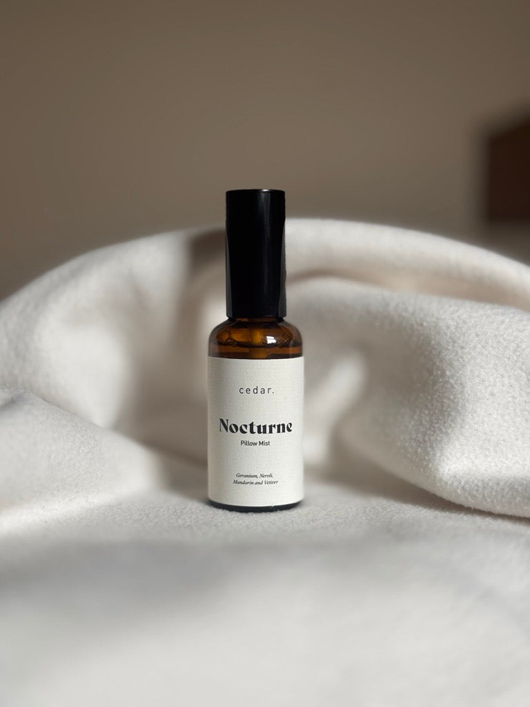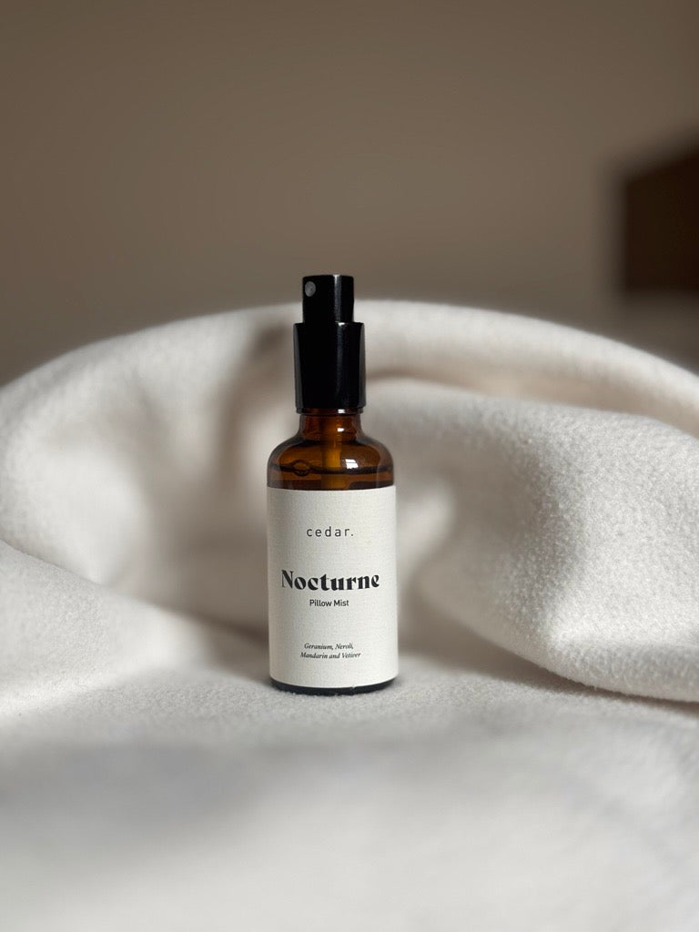 Nocturne is a 100% natural sleep spray with a unique blend of Geranium, Neroli, Mandarin, and Vetiver essential oils.